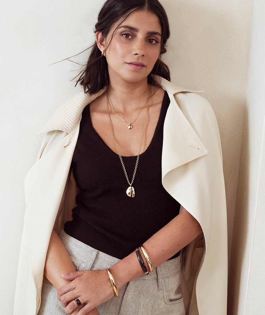 Brazalete escultórico Intervalo bañado con una gruesa capa de oro macizo de 18 kt, lo que garantiza una mayor durabilidad. Tiene un medida de 60 x 50 mm. Destaca por la piedra Esmaltes en tono marrón chocolate, color protagonista de la temporada, que aporta textura, brillo y un gesto de estilo propio. De la Colección MA de María G. de Jaime, que nace de una búsqueda intima para capturar esa luz que aparece en los momentos más sutiles y que habita en cada una de nosotras. Piezas con intención, con formas puras y juegos de contrastes, que nos acompañan a diario y encuentran su lugar de forma natural. Porque la verdadera elegancia no deslumbra, simplemente brilla porque tiene sentido.