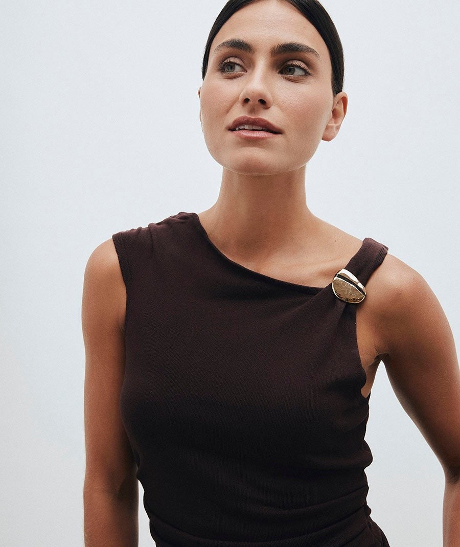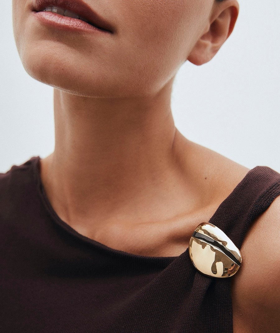 Este broche asimétrico Horizonte, bañado en oro macizo de 18 kt, combina elegancia y durabilidad en una pieza hipoalergénica. Su piedra de esmalte marrón, tono de tendencia, añade profundidad y textura refinada. Con unas medidas de 40 x 5,2 mm, ofrece un diseño sofisticado y cómodo para uso diario, ideal para quienes buscan estilo sin renunciar al confort.