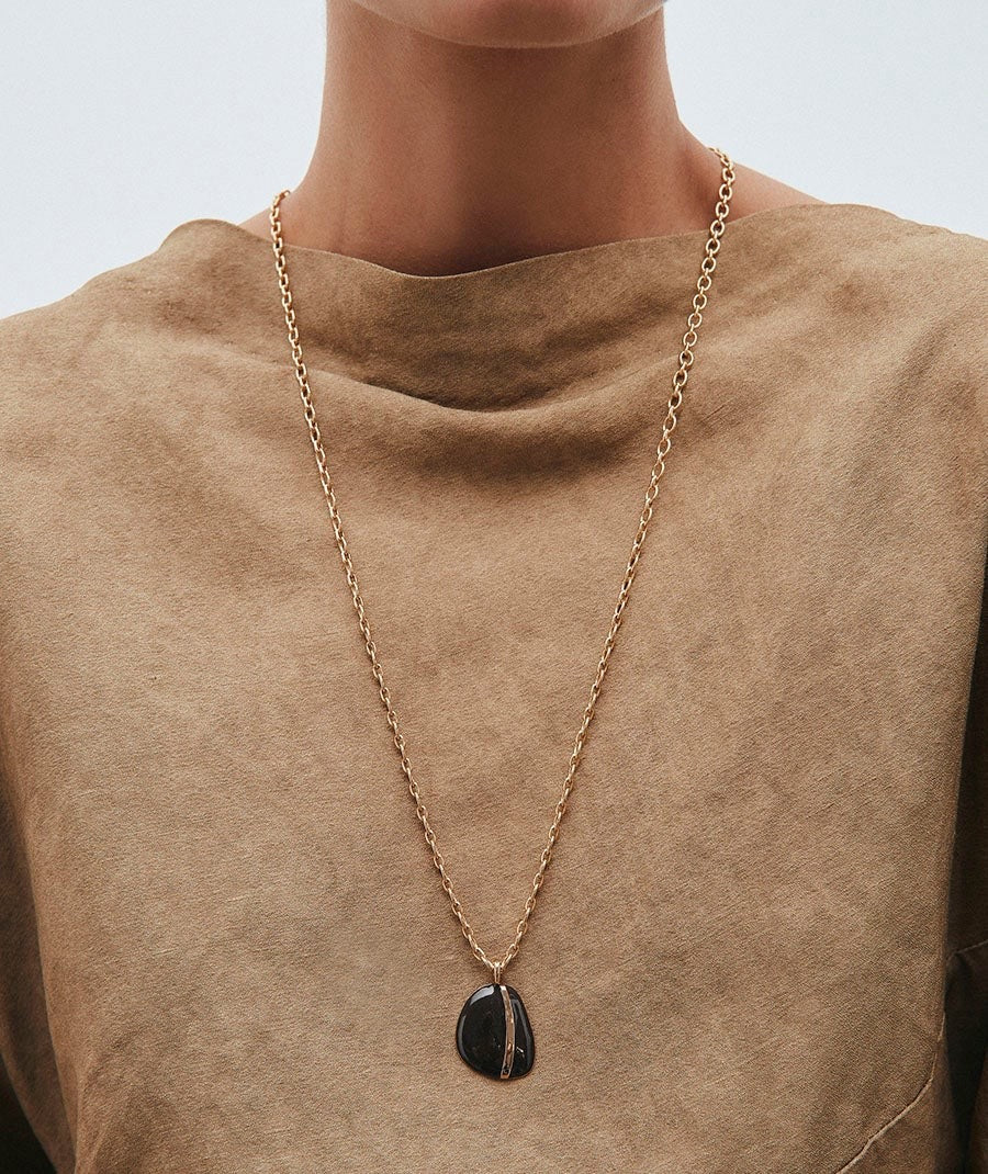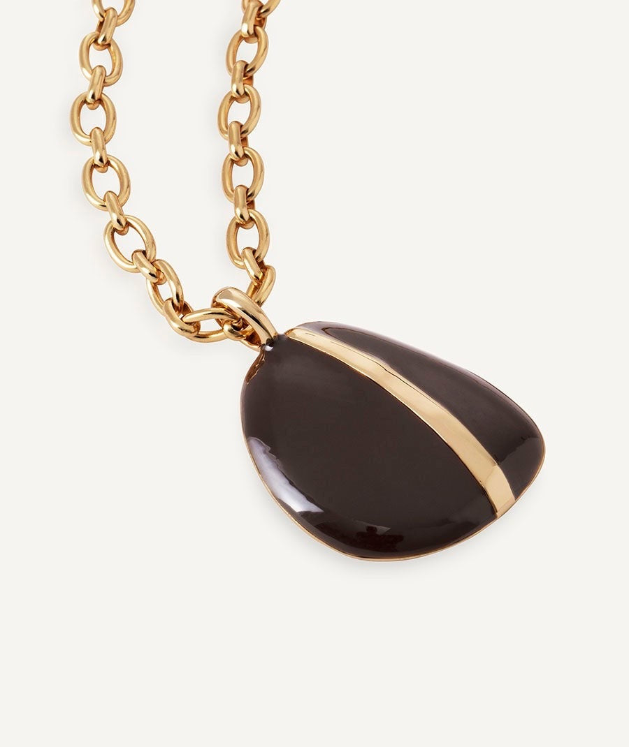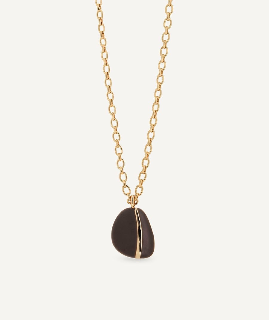 Colgante oval irregular maxi Intervalo bañado con una gruesa capa de oro macizo de 18 kt, lo que garantiza una mayor durabilidad. Destaca por la piedra Esmaltes en tono marrón chocolate, color protagonista de la temporada, que aporta textura, brillo y un gesto de estilo propio. Tiene una longitud de 75 cm. De la Colección MA de María G. de Jaime, que nace de una búsqueda intima para capturar esa luz que aparece en los momentos más sutiles y que habita en cada una de nosotras. Piezas con intención, con formas puras y juegos de contrastes, que nos acompañan a diario y encuentran su lugar de forma natural. Porque la verdadera elegancia no deslumbra, simplemente brilla porque tiene sentido.