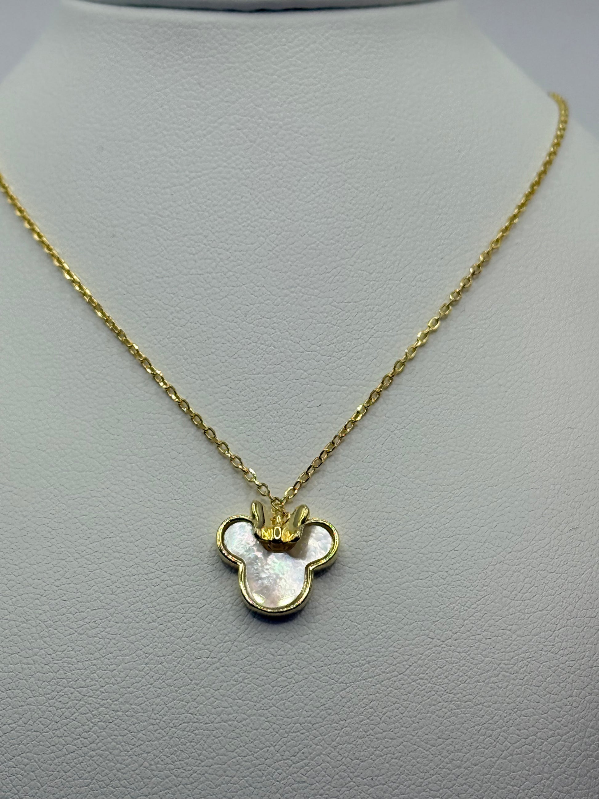 Descubre la elegante gargantilla Minnie de plata con baño dorado, con su atrayente colgante de nácar en forma de Minnie. Con una longitud ajustable de 45+5 cm, podrás adaptarla a cualquier ocasión. Adorna tu cuello con estilo y añade un toque de sofisticación a tus looks.