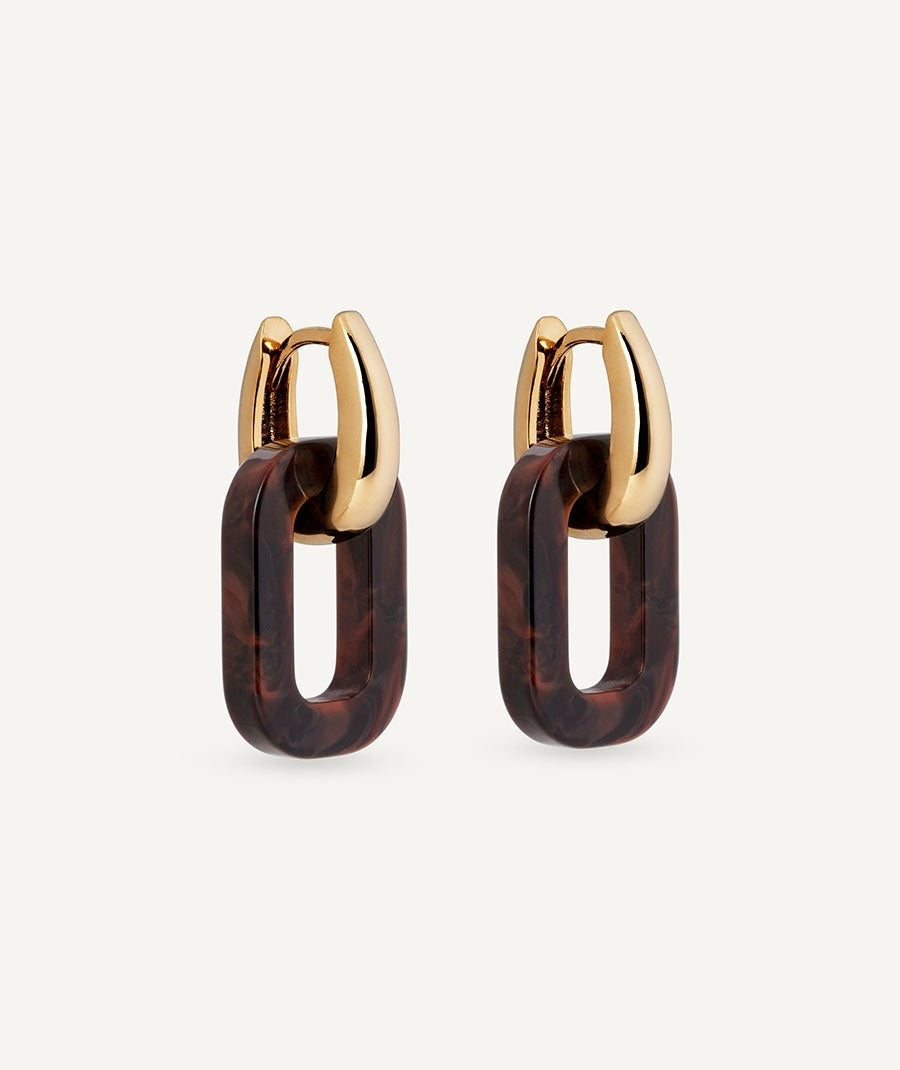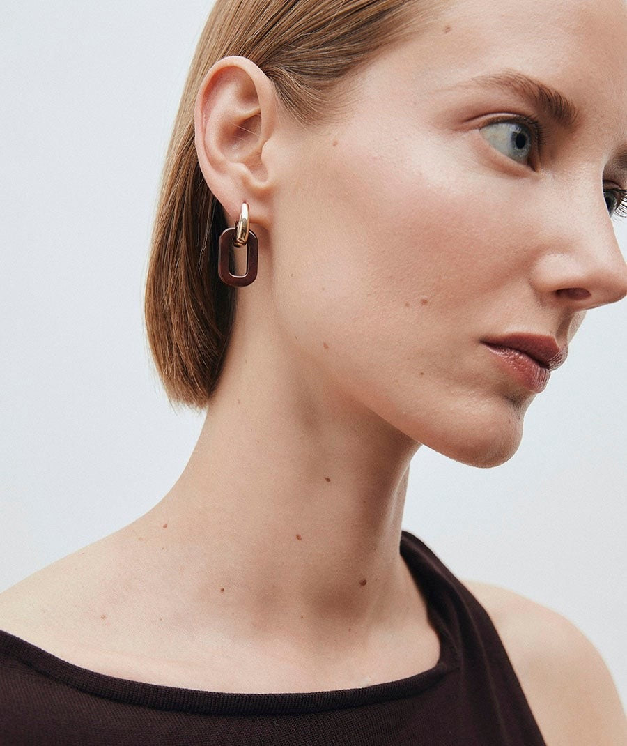 Pendientes de aro con cuadrado Coffee bañados con una gruesa capa de oro macizo de 18 kt, lo que garantiza una mayor durabilidad. Destacan por el acetato y resina en tono marrón, que aportan un aire de sofisticación en clave neutra. Tienen una medida de 30 mm y un cierre de aro articulado. Pertenecen a la colección Bold, inspirada en las tendencias actuales, con joyas de diseño y siluetas renovadas para una línea que trae color, donde dominan los tonos camel, marrón, caramelo y azul oscuro. Son piezas que, sin levantar la voz, transmiten un aire seguro, confiado y decidido.