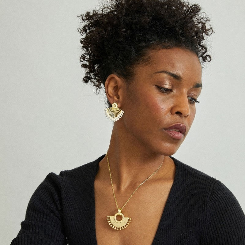 Estos pendientes de Luxenter reinterpretan diseños clásicos con una estética contemporánea. Su forma de abanico presenta terminales adornados con perlas cultivadas de agua dulce en tonalidad blanca, creando un efecto visual elegante y sofisticado. Con una longitud aproximada de 3 centímetros, ofrecen una presencia notable sin resultar excesivos. El cierre de palillo con tuerca a presión garantiza seguridad y comodidad durante el uso prolongado, asegurando que permanezcan perfectamente ajustados en la oreja. Una pieza versátil que combina tradición joyera con diseño refinado.