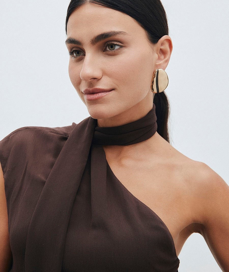 Pendientes volumen Suspiro bañados con una gruesa capa de oro macizo de 18 kt, lo que garantiza una mayor durabilidad. Destacan por la piedra Esmaltes en tono marrón chocolate, color protagonista de la temporada,que aporta textura, brillo y un gesto de estilo propio. Tienen una medida de 40 mm y un cierre a omega. De la Colección MA de María G. de Jaime, que nace de una búsqueda intima para capturar esa luz que aparece en los momentos más sutiles y que habita en cada una de nosotras. Piezas con intención, con formas puras y juegos de contrastes, que nos acompañan a diario y encuentran su lugar de forma natural. Porque la verdadera elegancia no deslumbra, simplemente brilla porque tiene sentido.
