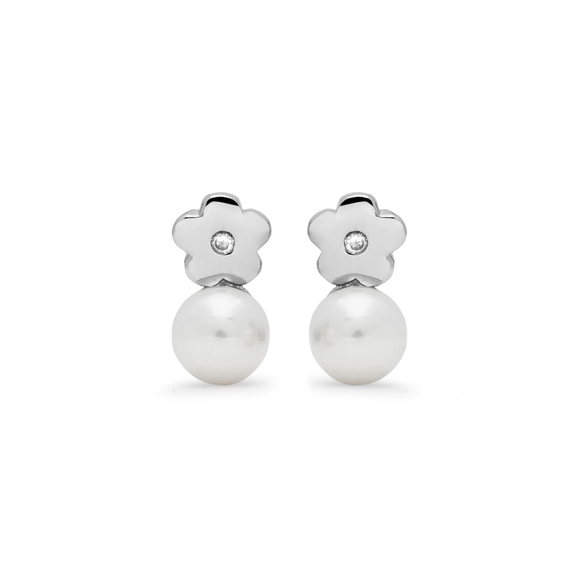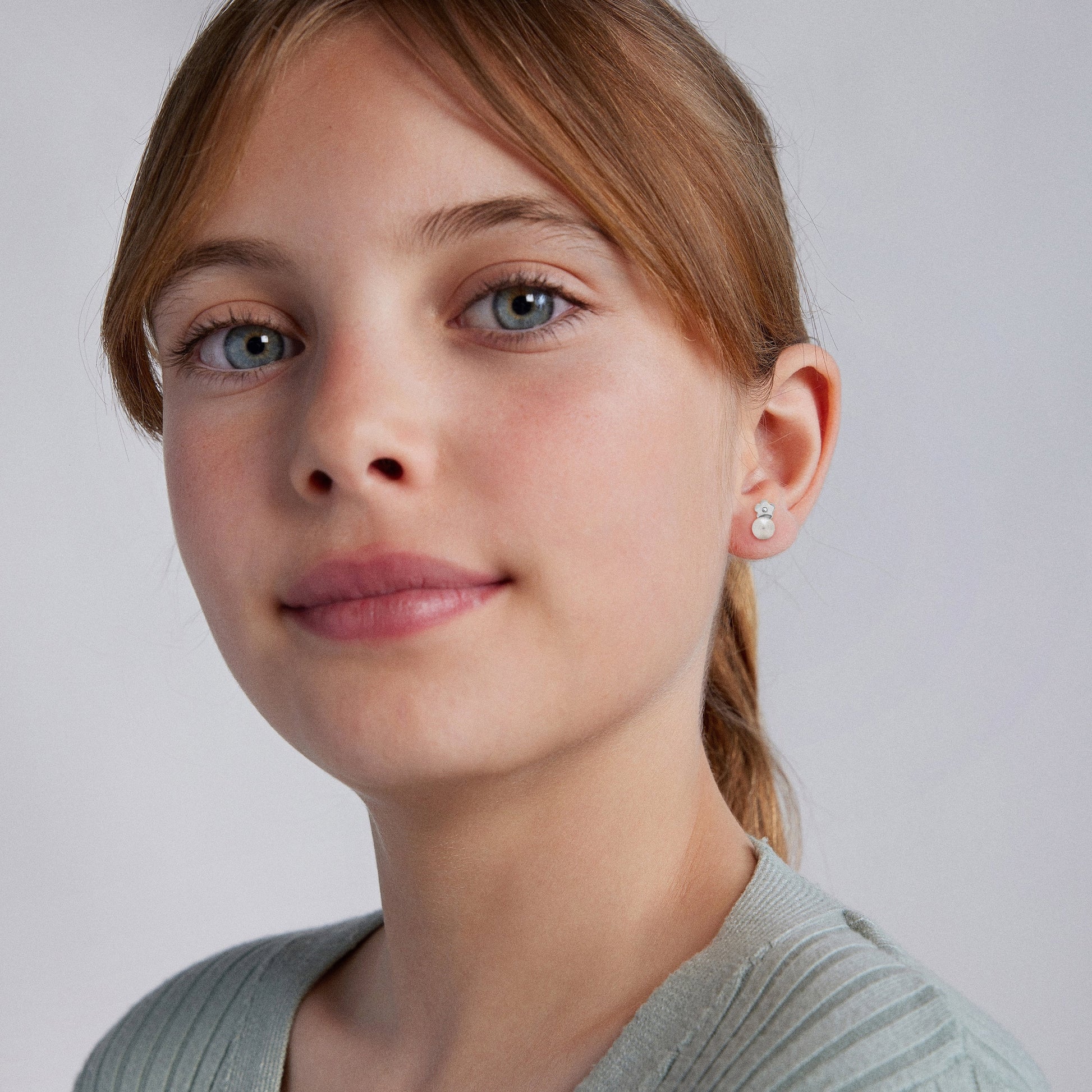 Pendientes con cierre de rosca zuga de plata de ley 925 y perla blanca con acabado en baño de rodio. Una colección de pendientes de rosca y colgantes únicos inspirados en la belleza de la luz que proporcionan los esmaltados de colores multicolores bañados en rodio, oro rosa y oro amarillo de 18 quilates sobre plata de Ley 925. Joyas que ganan popularidad gracias a su diseño, realizadas a mano con precisión matemática que dan lugar a formas variopintas sobredimensionadas ofreciendo un sinfín de posibilidades.